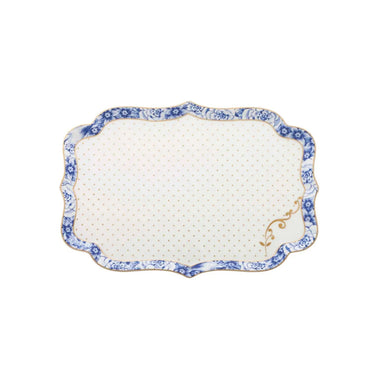 Vassoio in Porcellana Decorata 26 cm Royal White – Pip Studio: questo vassoio rettangolare della collezione Royal White è un perfetto esempio di come funzionalità ed estetica possano convivere armoniosamente. Realizzato in porcellana, presenta una forma ondulata distintiva che caratterizza la tavola con originalità. Il design combina elementi classici e moderni: una delicata cascata di pois dorati si distribuisce sulla base bianca del vassoio, creando un motivo luminoso e raffinato. Il bordo, impreziosito da un motivo floreale blu intenso, in contrasto piacevole con la leggerezza dei pois, ravviva il design. Un piccolo dettaglio dorato floreale rompe la simmetria creando un punto di interesse delicato. Il vassoio in porcellana è ideale per servire antipasti o finger food, dessert o plumcake, tè o caffè. La forma rettangolare e le dimensioni lo rendono un oggetto pratico e versatile, perfetto per le occasioni speciali o per godersi la quotidianità.