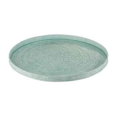 Vassoio Rotondo Classico in Ferro Colore Blu Large Ø 60 cm: realizzato in ferro, questo vassoio rotondo presenta un diametro di 60 cm. La superficie del vassoio è caratterizzata da un intricato motivo, che richiama lo stile orientale. La sua superficie ampia e resistente ti consente di presentare facilmente una varietà di pietanze, dalle portate principali ai dolci più elaborati. La sua combinazione di materiali e il design classico lo rendono un accessorio versatile e durevole.