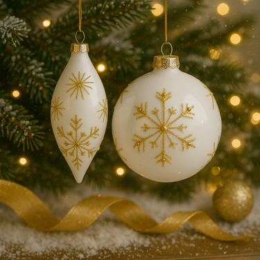 Rendi magico il tuo Natale con l'esclusivo set da 6 palline in vetro a forma di trottola firmato Viron. Create per catturare e riflettere la luce delle feste, queste decorazioni donano un'eleganza capace di trasformare il tuo albero in un vero capolavoro. Questo set si distingue per la sua splendida tonalità del bianco e per la sua finitura lucida, pensata per chi ama un design originale. Realizzate in vetro, ogni pallina è impreziosita da un dettaglio di un decoro a rilievo con glitter e strass dorati che ne esalta la raffinatezza.