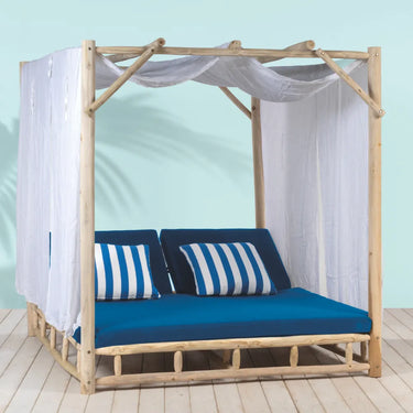 Lettino Prendisole Doppio Reclinabile per Esterno in Legno Teak h 200 cm – Eden: immagina il tuo giardino, il bordo piscina o il patio trasformati in un'oasi di tranquillità grazie a questo lettino doppio reclinabile, un vero e proprio invito al relax per te e chi ami. Costruito in legno di teak massello, noto per la sua resistenza e bellezza naturale, questo lettino è progettato per gli spazi esterni, affrontando con eleganza ogni stagione. La sua struttura doppia offre spazio abbondante per godersi il sole in compagnia, mentre lo schienale reclinabile permette di trovare sempre la posizione perfetta per il tuo comfort. I morbidi cuscini blu, idrorepellenti, aggiungono un tocco di colore e un comfort extra, invitandoti a trascorrere lunghe ore di relax all'aperto. Il design classico del lettino si integra armoniosamente in qualsiasi ambiente esterno, dal più tradizionale al più contemporaneo, rendendolo il fulcro del tuo spazio all'aperto. Questo lettino doppio reclinabile in teak massello è più di un semplice arredo: è un complemento d’arredo ideato per il tuo benessere, un angolo di paradiso dove potrai rigenerarti e goderti la bellezza della vita all'aria aperta. Questo lettino è progettato per offrire il massimo del comfort, grazie al telo parasole integrato che permette di ripararti all'ombra. Inoltre, sono inclusi due cuscini aggiuntivi dallo stile marittimo, che ti permetteranno di personalizzare ulteriormente la tua esperienza di relax.