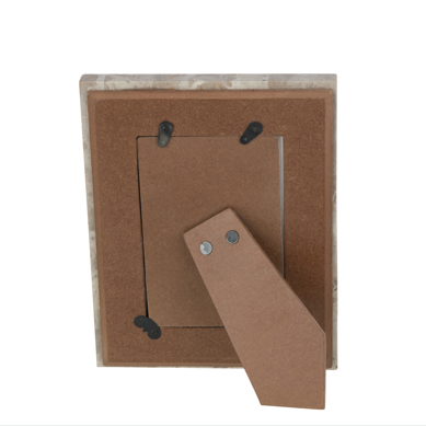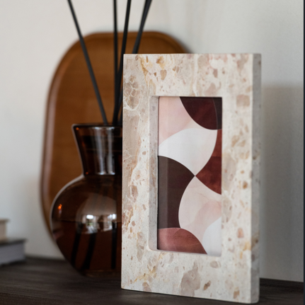 Portafoto in marmo beige 10x15, ideale per arredare ambienti interni con uno stile moderno ed elegante. Un complemento decorativo raffinato, perfetto per valorizzare fotografie e ricordi personali.
