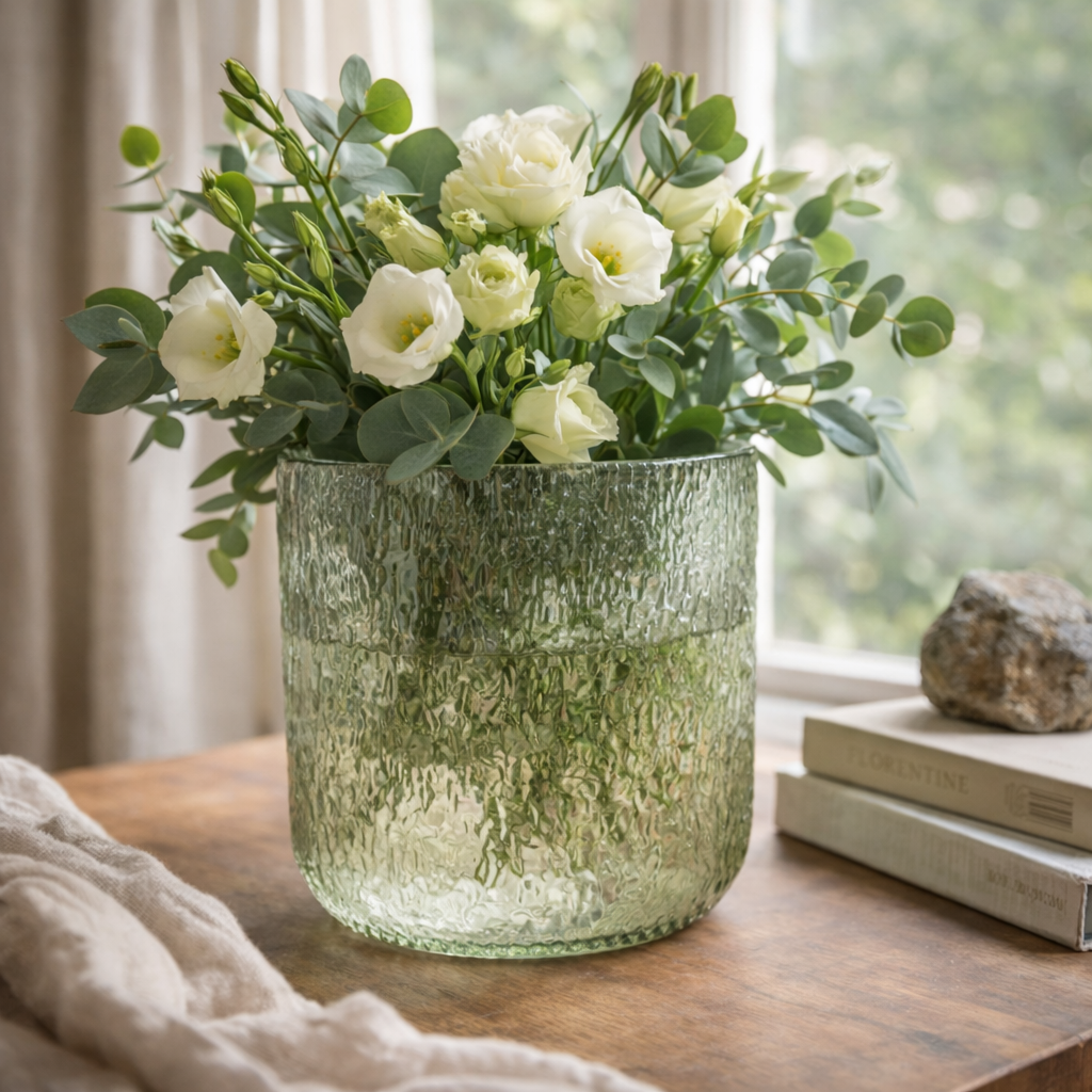 Vaso decorativo in vetro verde della linea Mila, caratterizzato da una superficie testurizzata che valorizza la luce e dona profondità visiva. La tonalità verde trasparente lo rende ideale come vaso in vetro per fiori, vaso decorativo da interno o elemento d’arredo per soggiorni, ingressi e tavoli.