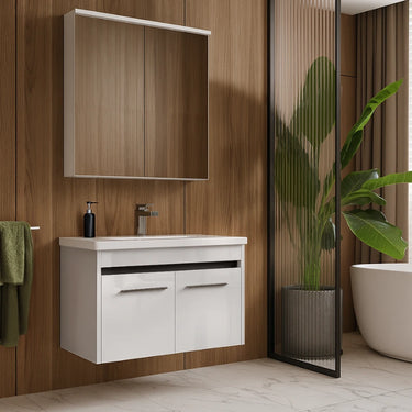 Il Mobile Bagno Sospeso Colore Bianco con Lavabo Integrato in Ceramica e Specchio Contenitore – Maria è una soluzione elegante e funzionale per arredare il bagno con design moderno e praticità. Il mobile presenta un ampio vano con due ante con chiusura soft-close. Il lavabo integrato in ceramica è progettato per essere anti-macchia e facile da pulire, mantenendo sempre un aspetto impeccabile. All'interno della composizione è incluso uno specchio contenitore a due ante con chiusura soft-close ed un ripiano interno utile a contenere tutti gli oggetto della tua routine quotidiana.