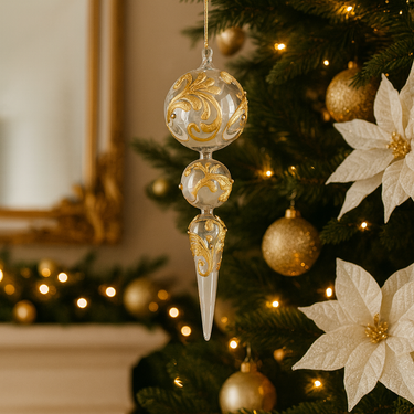 Pendente Natalizio in Vetro Soffiato Trasparente con Decori Oro h 38 cm - Viron
