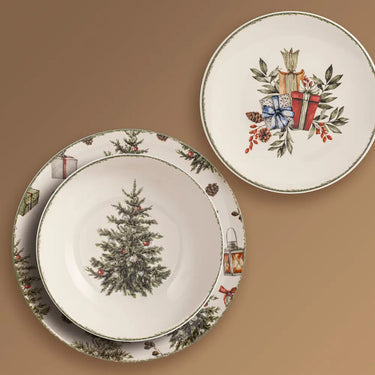 Servizio 18 pezzi tavola Christmas Carol in stoneware decorati ideale per il tuo pranzo di Natale. Il set tavola è composto da 6 piatti piani cm 26, 6 piatti fondi cm 20,5, 6 piatti frutta cm 19,5. I piatti sono idonei al lavaggio in lavastoviglie e all'uso in forno a microonde.