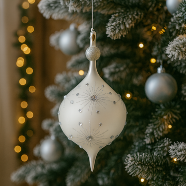Un set di 4 pendenti a goccia Viron che cattura l'essenza più pura della luce invernale. Realizzati in vetro soffiato con una delicata finitura bianco perlato, riflettono la luce con una luminosità morbida e diffusa. Eleganti decori in argento tracciano motivi raffinati sulla superficie, impreziositi da strass applicati a rilievo che brillano come cristalli di brina. Un tocco di classe intramontabile per un Natale all'insegna della raffinatezza.