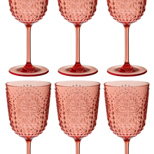 Set da 6 bicchieri da vino infrangibili rossi, ideali per il servizio di vino, spritz e cocktail. La forma slanciata e la capacità di 414 ml li rendono adatti sia all’uso quotidiano che a contesti conviviali.