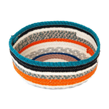 Cestino da Tavola Ø 20 cm in Fibre Naturali Patchwork Multicolore: il cestino da tavola patchwork multicolore fatto a mano è realizzato da una combinazione di colori vivaci e contrastanti. Il design caratterizzato dall'intreccio di strisce di tessuto cucite insieme grazie all'attenzione ai dettagli, crea un effetto a strati che esalta la texture e la vivacità dei colori. Questo cestino è funzionale per contenere piccoli oggetti o per essere utilizzato a tavola come portapane e portafrutta, ideale per diversi ambienti della casa come salotto, cucina e bagno. Perfetto come elemento decorativo, il cestino multicolore con fantasia patchwork unisce funzionalità ed estetica.