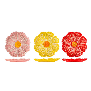 Dai un'esplosione di colore alla tua mise en place con questo allegro set di 3 piatti in ceramica. Ogni piatto, con il suo diametro di 23 cm e la sua deliziosa forma a fiore, si tinge di una tonalità vivace: giallo solare, rosso vitaminico e rosa delicato.