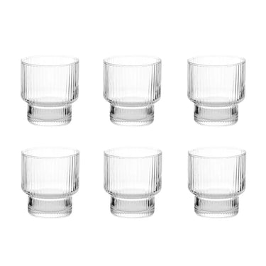 Set 6 Bicchieri Acqua Impilabili in Vetro Trasparente 32 cl Bliss – H&H: il set di 6 bicchieri acqua Bliss, realizzati in vetro trasparente con un'elegante lavorazione rigata, aggiunge un tocco di raffinatezza alla tua tavola quotidiana. Con una capacità di 32 cl, questi bicchieri sono ideali per servire acqua, succhi di frutta o altre bevande fresche. La loro caratteristica impilabile li rende particolarmente pratici, ottimizzando lo spazio nella tua cucina. Il vetro trasparente, con le delicate rigature, esalta la luminosità delle bevande, creando un'atmosfera piacevole e conviviale. La resistenza del vetro e la facilità di pulizia, grazie alla compatibilità con la lavastoviglie, li rendono perfetti per l'uso quotidiano, unendo funzionalità e stile in un unico set.