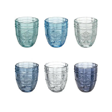Ispirato ai toni intensi del vino Syrah, questo set da 6 bicchieri acqua Syrah Ocean porta in tavola un'eleganza sontuosa. Ciascun bicchiere presenta un raffinato decoro arabescato che anima la superficie, e il set si distingue per le sue diverse tonalità di blu, aggiungendo vivacità e unicità alla tua tavola. Realizzati in vetro, i bicchieri hanno con una capacità di 265 ml, sono ideali per servire acqua, bibite, succhi di frutta o altre bevande. Sono inoltre comodamente lavabili in lavastoviglie, garantendo praticità e stile in ogni occasione.