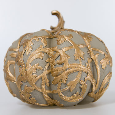 Zucca Decorativa in Resina Colore Grigio con Dettaglio Foglie in Rilievo Colore Oro