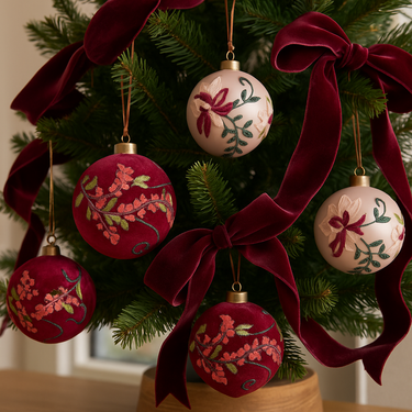 Set 6 Sfere Natale in Vetro Velluto Rosso Scuro con Ricamo fiorato Ø10 cm - Viron