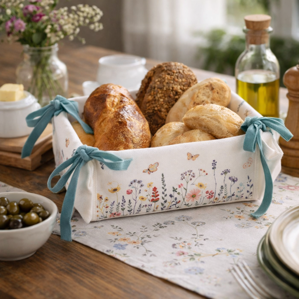 Cestino per Pane in Cotone Motivo Floreale Colore Bianco e Verde Acqua
