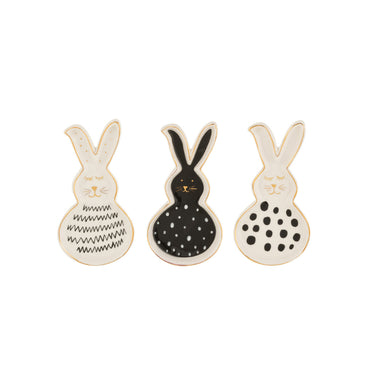 Set 3 Piattini Decorativi Pasqua Coniglio 19,5 cm Medium - Japanese: perfetti come decorazione o per cioccolatini e caramelle, questi piattini in ceramica bianca e nera con bordino dorato sono un'idea originale e divertente. La forma a coniglio e le tre diverse fantasie rendono questi piattini unici e simpatici, perfetti per la tua tavola di Pasqua o per creare un'atmosfera festiva. Il contrasto tra bianco e nero, con l'eleganza del bordino dorato, si adatta facilmente ad ogni stile. Il set di 3 piattini può essere usato come porta cioccolatini, caramelle, ovetti o dolcetti, oppure utilizzato come centrotavola o decorazione per mensole e tavolini. Questi piattini decorativi, realizzati in ceramica, sono perfetti come idea regalo per la Pasqua, puoi confezionarli con della carta trasparente e dei fiocchi colorati aggiungendo dei piccoli ovetti che richiamano la festività.