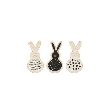 Set 3 Piattini Decorativi Pasqua Coniglio 13,5 cm Small - Japanese: perfetti come decorazione o per cioccolatini e caramelle, questi piattini in ceramica bianca e nera con bordino dorato sono un'idea originale e divertente. La forma a coniglio e le tre diverse fantasie rendono questi piattini unici e simpatici, perfetti per la tua tavola di Pasqua o per creare un'atmosfera festiva. Il contrasto tra bianco e nero, con l'eleganza del bordino dorato, si adatta facilmente ad ogni stile. Il set di 3 piattini può essere usato come porta cioccolatini, caramelle, ovetti o dolcetti, oppure utilizzato come centrotavola o decorazione per mensole e tavolini. Questi piattini decorativi, realizzati in ceramica, sono perfetti come idea regalo per la Pasqua, puoi confezionarli con della carta trasparente e dei fiocchi colorati aggiungendo dei piccoli ovetti che richiamano la festività.