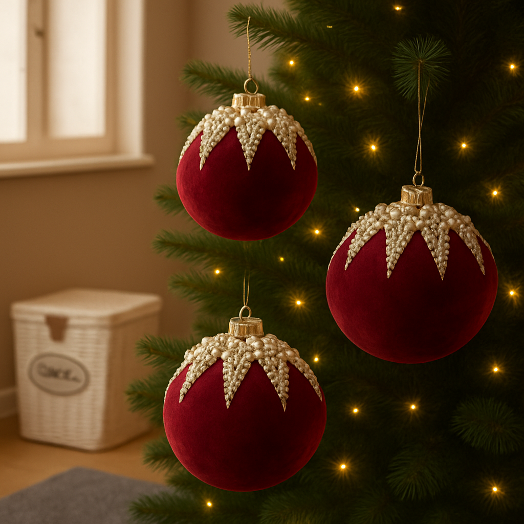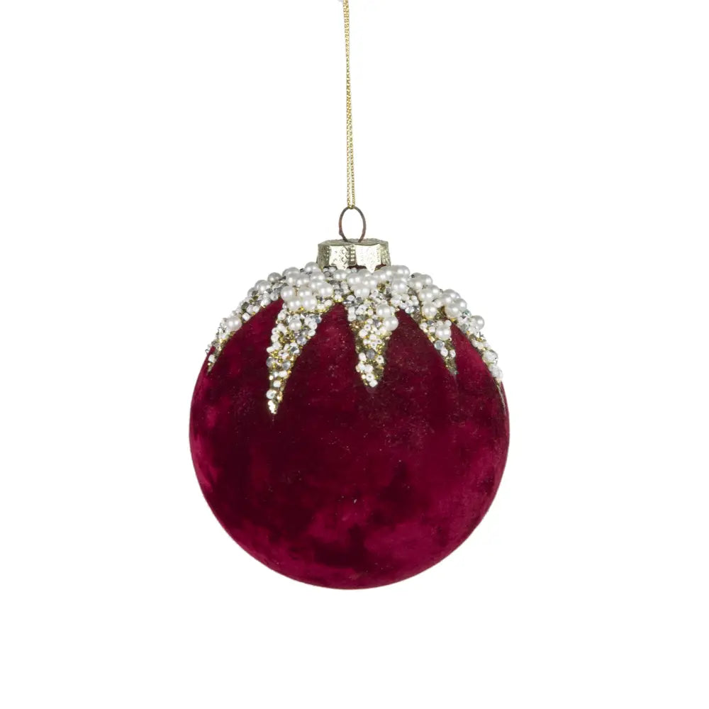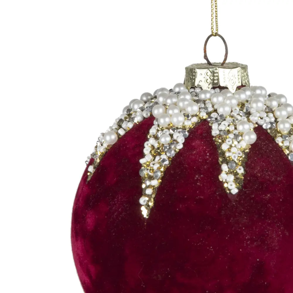 Set 6 Palline di Natale in Vetro Effetto Velluto Rosso con Perline Ø10 cm - Viron