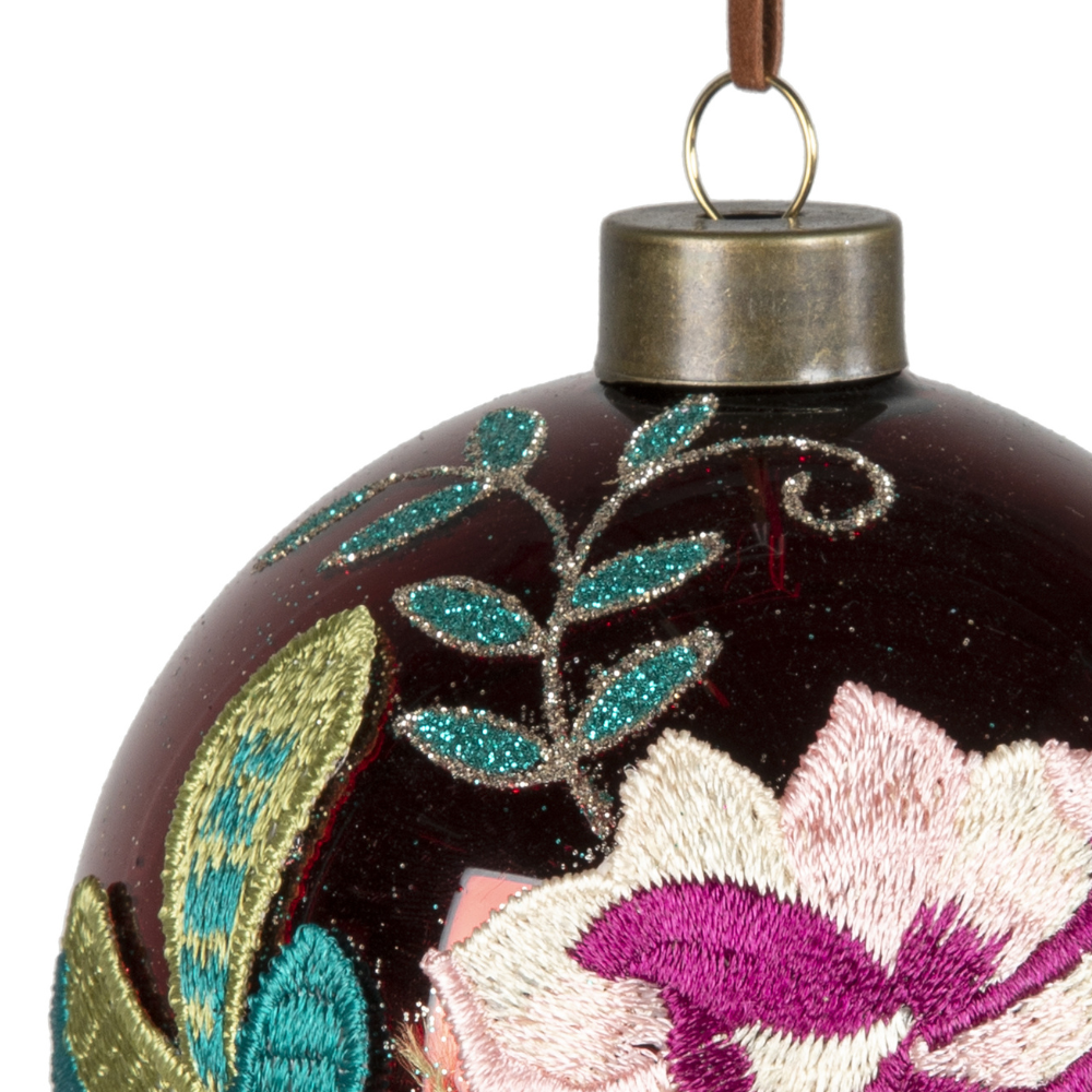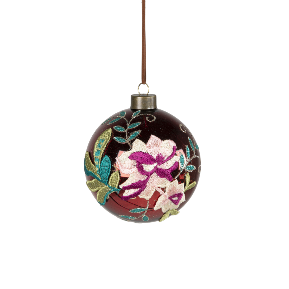 Set 6 Sfere Natale in Vetro Lucido Rosso Scuro e Ricamo Fiorato Ø 10 cm - Viron