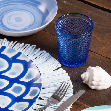Il design si ispira alle sfumature più profonde e affascinanti dell'oceano, con tonalità di blu che sfumano e si intrecciano, rendendo ogni bicchiere un pezzo unico. La lavorazione a nido d'ape, che ricorda le preziose geometrie della natura, non solo impreziosisce il bicchiere ma garantisce anche una presa comoda e sicura.