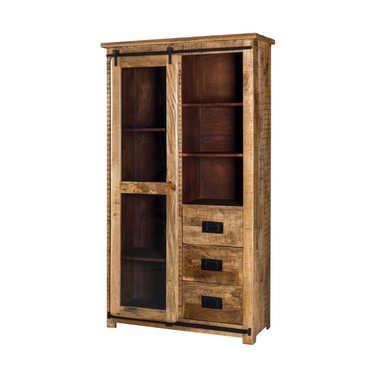Credenza Vetrina in Legno di Mango 1 Anta 3 Cassetti Colore Naturale Stile Industrial