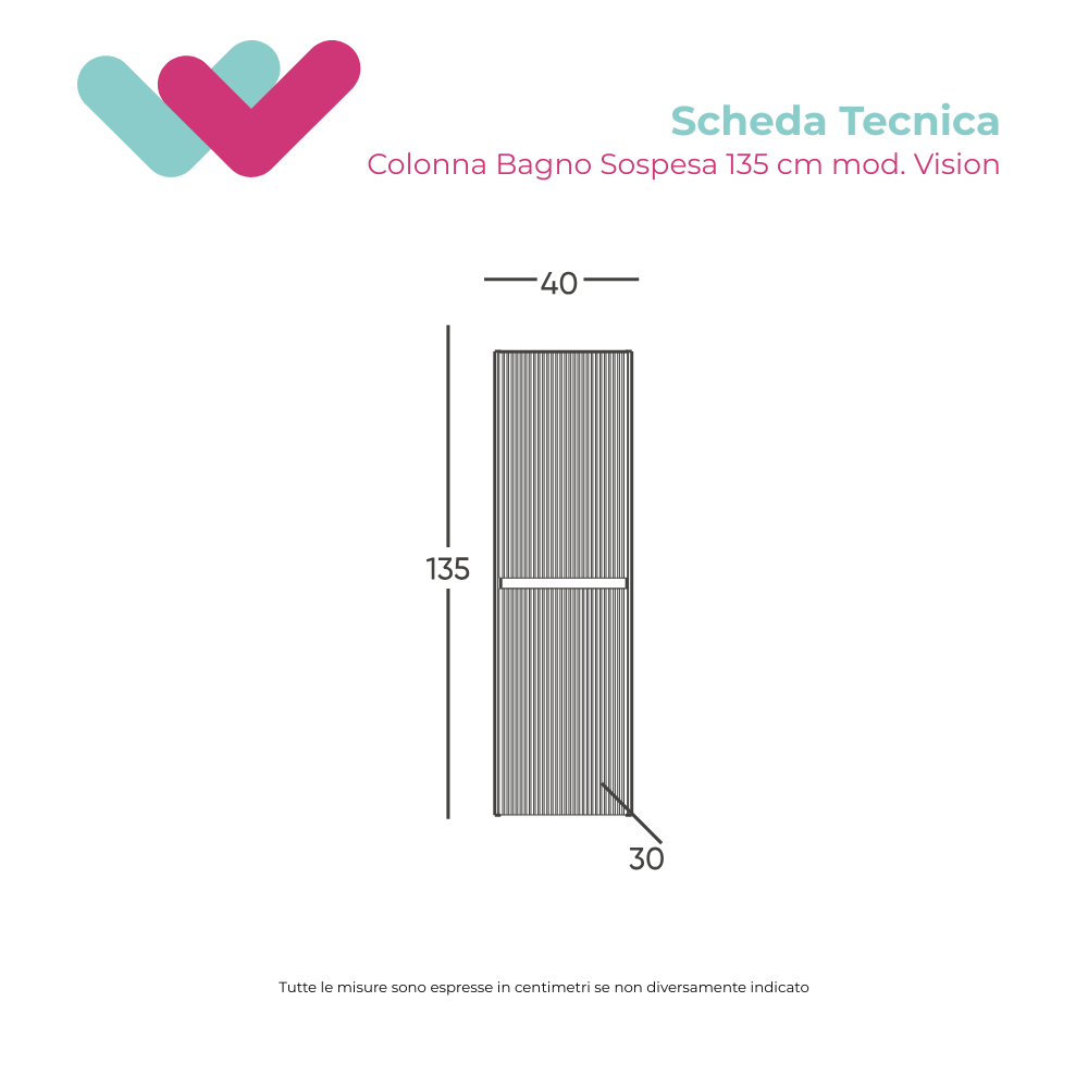 La Colonna Bagno Sospesa 135 cm Colore Verde Oliva Effetto Cannettato - Vision è la soluzione ideale per ottimizzare l'uso degli spazi all'interno del bagno. La sua struttura in Mdf laccato assicura resistenza all’umidità e durata nel tempo, mantenendo un’estetica raffinata e contemporanea, arricchita dalla sua particolare lavorazione che dona profondità e carattere. Le sue due ante in Mdf laccato presentano cerniere con sistema di chiusura ammortizzato (soft-close), al cui interno si aprono due pratici ripiani in vetro temperato che suddividono l'interno della colonna in quattro scomparti che permettono di sfruttare al meglio gli spazi verticali, offrendo una capienza ottimale per riporre asciugamani, prodotti di bellezza e accessori.