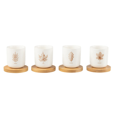 Set 4 Tazzine da Caffè con Piattino in Bambù Foglie: ogni tazza presenta un delicato design di foglie autunnali, ispirato alle diverse varietà di alberi. Rendendo ogni tazzina unica e raffinata. Realizzate in ceramica, queste tazzine sono perfette per servire il caffè durante le giornate più fresche dell’autunno, rendendo un piacere le tue pause quotidiane. Il design semplice ed elegante, il colore neutro e i dettagli in delle foglie in marrone caldo le rendono perfette per qualsiasi stile di arredo. Ogni tazzina da caffè è dotata di un piattino in bambù perfetto per servire il caffè ai tuoi ospiti. Ideali per uso quotidiano o per arricchire la tua tavola durante le occasioni speciali, questo set 4 di tazzine è un’aggiunta perfetta alla tua collezione di stoviglie. Un’ottima idea regalo per gli amanti della stagione autunnale, queste tazzine senza manico offrono una combinazione perfetta di funzionalità e design stagionale.
