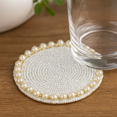 Un set di quattro sottobicchieri che unisce funzionalità e stile. Realizzati su una base in cotone, sono interamente ricoperti da un fitto ricamo di perline bianche applicate a mano, che creano una superficie brillante e piacevole al tatto. Perfetti per proteggere ogni superficie con un tocco di luce, sono ideali per per le occasioni speciali e le festività trascorse con amici e famiglia. La natura artigianale del prodotto assicura che ogni pezzo sia unico con un diametro Ø10 cm e il design che ne luminoso valorizza la tavola e si abbina splendidamente a servizi in vetro o cristallo. Si consiglia di pulire con un panno umido.