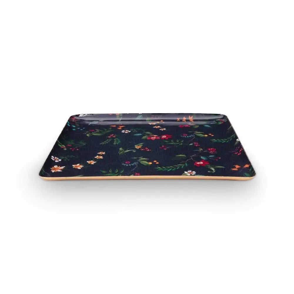 Arricchisci la tua casa con l'eleganza e la versatilità di questo vassoio in metallo, parte della nostra suggestiva collezione Berry Blues. La sua superficie è un incantevole quadro blu scuro, decorato con un raffinato disegno floreale dove rami sinuosi si intrecciano con eleganti fiori di fantasia e bacche colorate.