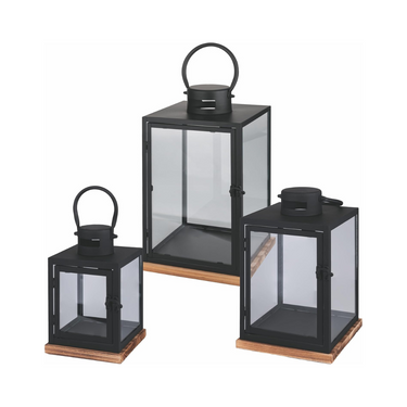 Set 3pz Lanterne in Ferro con Base in Legno di Pino Colore Nero Opaco