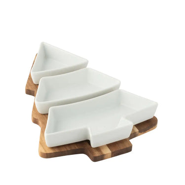 Set 3 Piattini da Tapas Albero di Natale in Ceramica Bianca con Supporto di Legno - Winter Glow