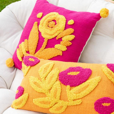 Per un abbinamento armonioso, il cuscino giallo può essere affiancato al cuscino rettangolare ricamato a fiori color fucsia, della stessa linea, creando un contrasto cromatico equilibrato e decorativo.