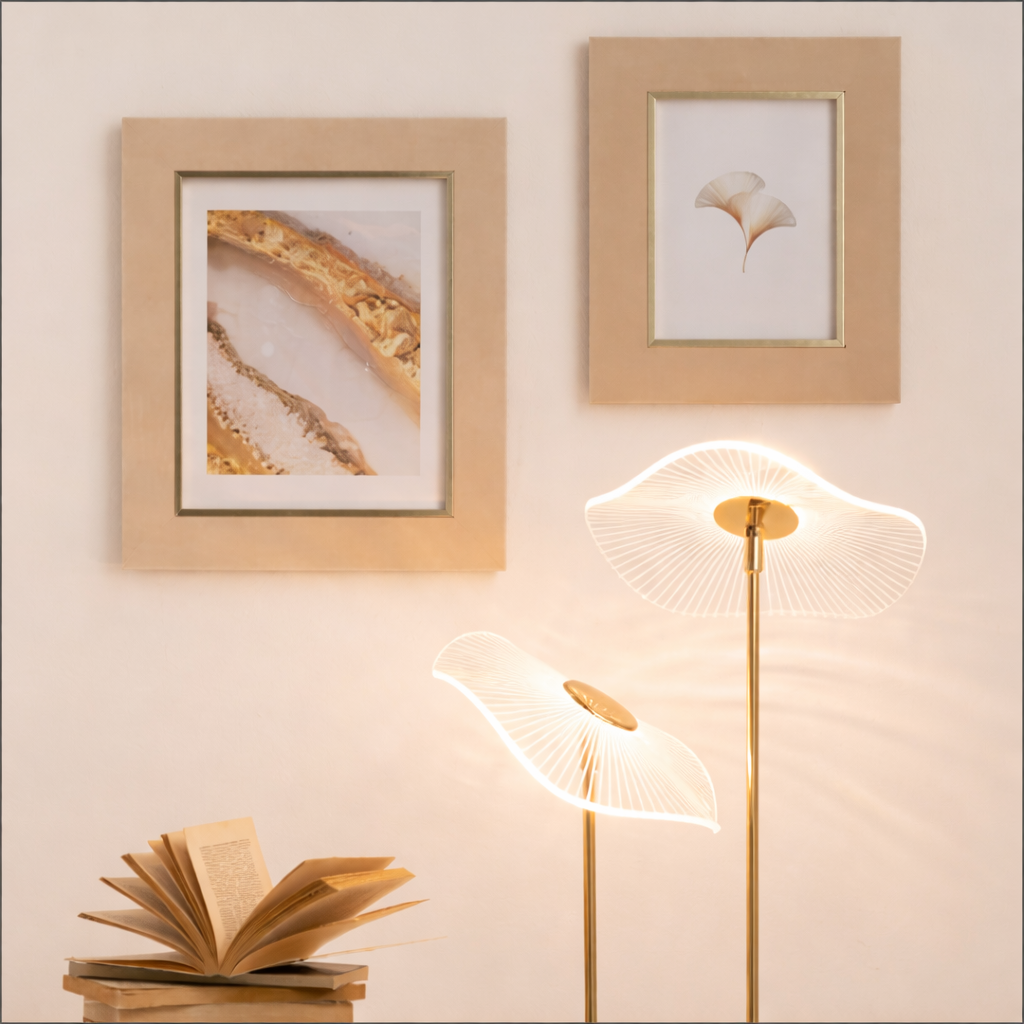Portafoto in velluto beige progettato per fotografie formato 20x25 cm, ideale per immagini di grande impatto visivo. Grazie alla doppia modalità di utilizzo, può essere posizionato su piano oppure appeso a parete, diventando un elemento protagonista dell’arredo.