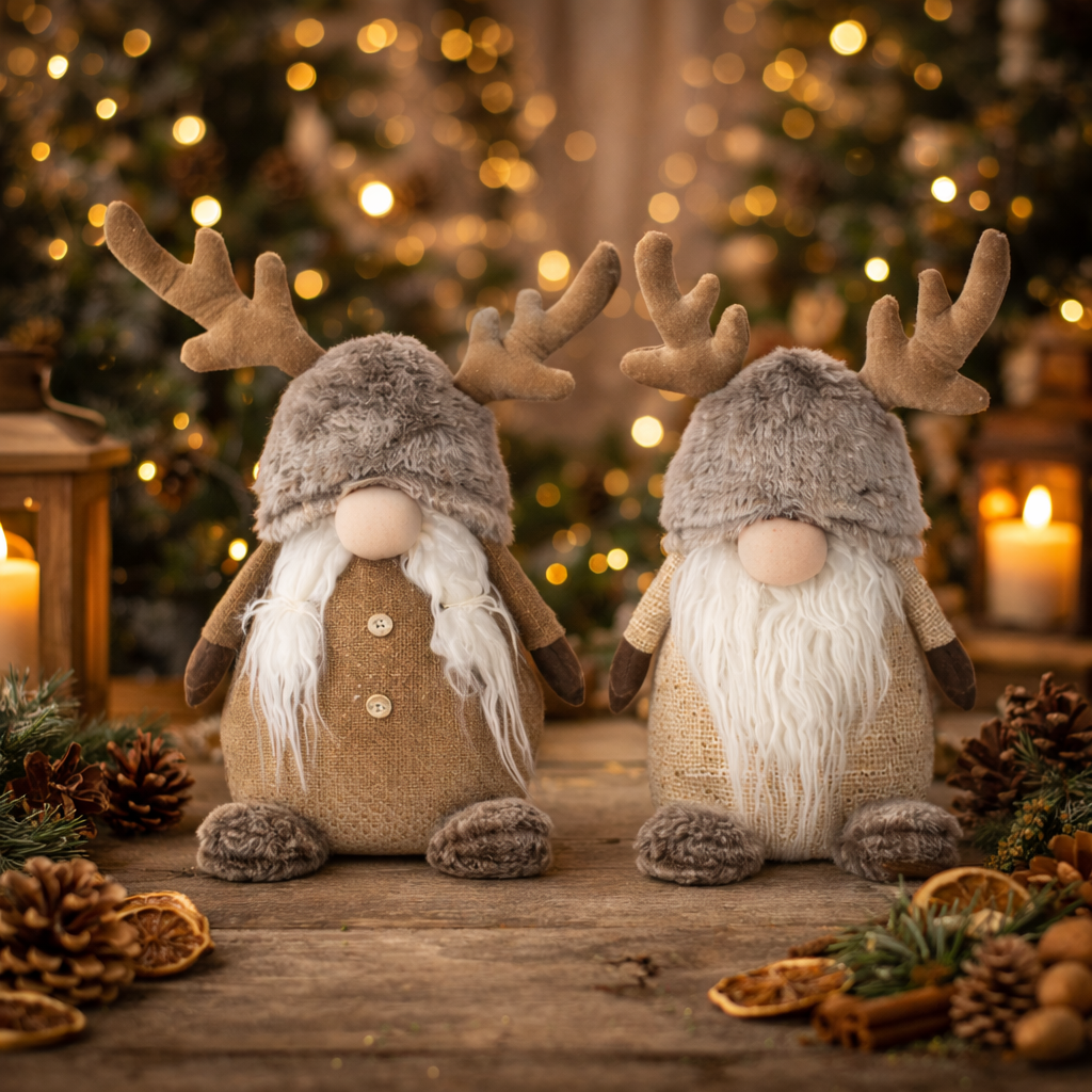 Questo set di 2 gnomi natalizi renna decorativi è pensato per arredare la casa durante il periodo natalizio con uno stile caldo e accogliente. Gli gnomi sono caratterizzati da corna di cervo, cappello in tessuto e finiture nei toni marrone e grigio, perfetti per ambienti naturali ed eleganti.