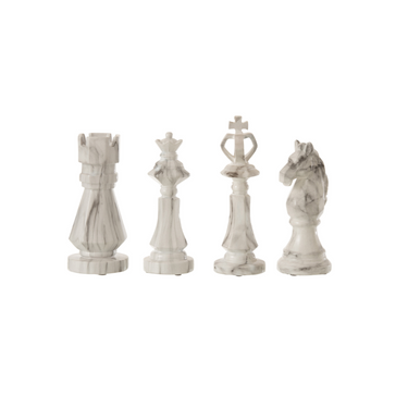 Per gli amanti degli scacchi, proponiamo un’esclusiva un set di 4 statuette decorative in resina con effetto marmo bianco ideale come soprammobili o come ricercata idea regalo. Ogni singolo pezzo della scacchiera è alto 23 cm, perfetti come elementi decorativi. Un'aggiunta raffinata e versatile per la propria casa, ideale per arricchire ogni spazio con un tocco di stile unico e personalizzato