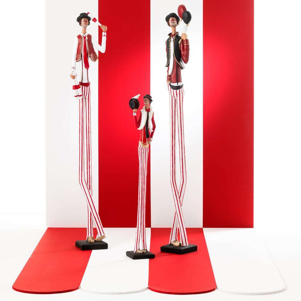 Questo set include tre statuine decorative, realizzate in poliresina e caratterizzate da una notevole altezza di 84 cm. Le figure rappresentano personaggi stilizzati che richiamano l'immaginario circense o degli artisti di strada, grazie alle loro proporzioni allungate e ai costumi vivaci. Ogni scultura poggia su una base quadrata di colore scuro che ne garantisce la stabilità.