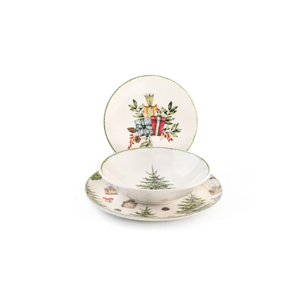 Servizio 18 pezzi tavola Christmas Carol in stoneware decorati ideale per il tuo pranzo di Natale. Il set tavola è composto da 6 piatti piani cm 26, 6 piatti fondi cm 20,5, 6 piatti frutta cm 19,5. I piatti sono idonei al lavaggio in lavastoviglie e all'uso in forno a microonde.