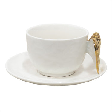 Tazza da Tè in ceramica bianca con piattino. L'alta qualità della ceramica della tazza da tè garantisce un uso duraturo del prodotto e una buona tenuta dei colori. La tazza da tè Winks ha una capienza di 175 ml ed è dotata di un bellissimo manico a forma di ali nel colore dorato elegante e raffinato. Una coccola perfetta per gli amanti del tè e se stati cercando un regalo speciale per una persona cara il set Winks è la soluzione ideale.