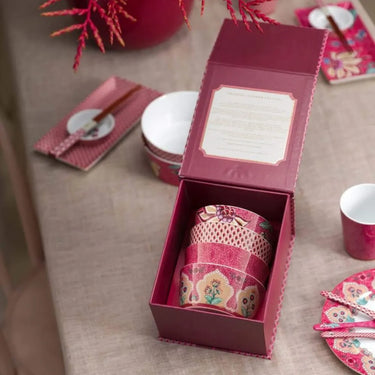 Set 4 Ciotole in Porcellana Colore Rosa Ø 12 cm Flower Festival – Pip Studio: completa il tuo servizio da tavola con questo set di quattro ciotole in porcellana della collezione Flower Festival. Ogni ciotola, con il suo sfondo rosa intenso, è impreziosita da un raffinato design. La ricca composizione floreale presenta una varietà di fantasiosi fiori chintz rossi e rosa, accompagnati da delicate foglie azzurre e verdi. Con la porcellana Flower Festival, la tua credenza e la tua tavola risplenderanno di nuova luce. Parte della collezione Flower Festival, queste ciotole hanno un diametro di 12 cm e sono presentate in una confezione regalo. Questo set di 4 ciotole sembra combinare influenze orientali, motivi floreali classici e un pizzico di estro retrò, creando un'estetica unica e accattivante. I motivi floreali stilizzati, in particolare i fiori chintz, richiamano le decorazioni tipiche delle porcellane orientali, specialmente cinesi e giapponesi. Sono ideali per presentare piccole porzioni di dessert, come macedonie di frutta, creme o dolci al cucchiaio oppure essere utilizzate per servire salse, condimenti o stuzzichini durante un aperitivo o un brunch.