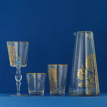 Set 6 Calici da Vino in Vetro Decorati 360 ml Royal White– Pip Studio: questo set di 6 bicchieri in vetro della collezione Royal Golden di Pip Studio è pensato per chi ama circondarsi di oggetti per la tavola dall’effetto visivo sorprendente. Ogni bicchiere, realizzato in vetro trasparente, è decorato con un delicato motivo floreale blu e oro, che dona un'impronta di eleganza a qualsiasi apparecchiatura. Dal design distintivo, la collezione Royal White si caratterizza per i suoi disegni floreali elaborati e i dettagli dorati, ispirati all'arte orientale. Ogni bicchiere presenta un elegante stelo con due sfere in vetro, che lo rende un complemento ricercato. Ideale per servire vino, cocktail o altre bevande, questi bicchieri sono perfetti per valorizzare cene, festività e aperitivi.