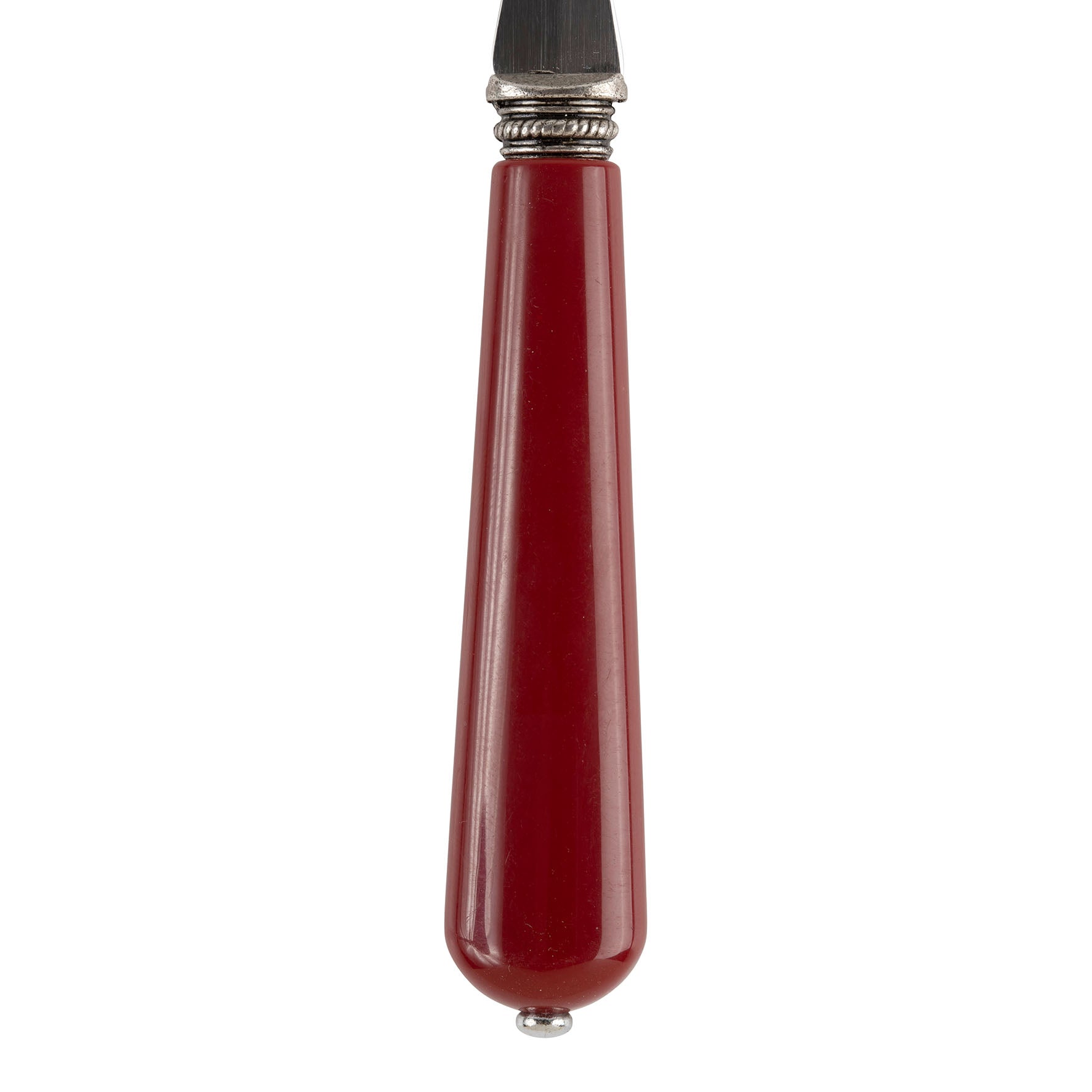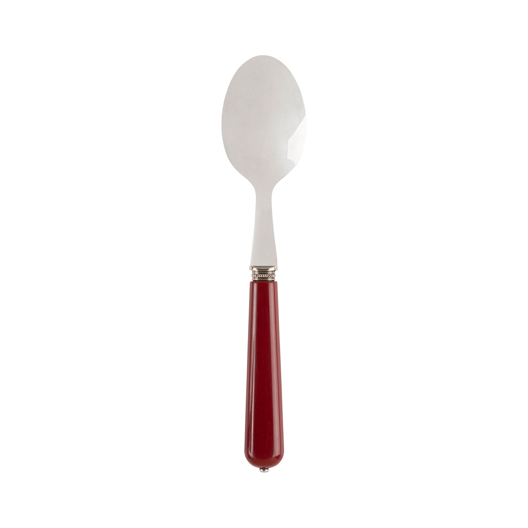 La testa del cucchiaio è in acciaio inox lucido di alta qualità, ideale per zuppe, primi piatti o porzioni di dolci, garantendo resistenza e facilità di pulizia. L'elemento distintivo del set è il manico bombato e affusolato, di un intenso colore rosso ciliegia. Il manico offre una presa ergonomica e piacevole; è rifinito con dettagli in metallo che ne esaltano il carattere elegante e leggermente retrò.