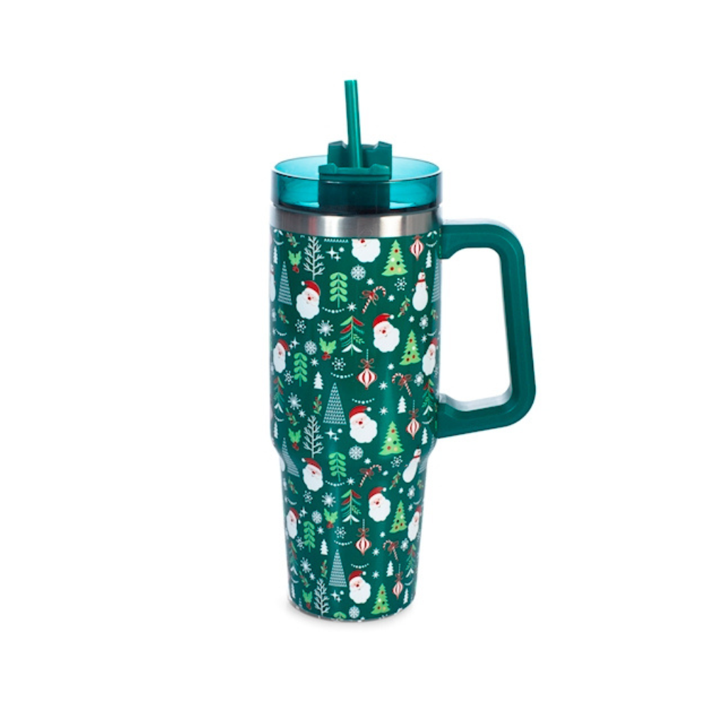 Tazza Termica Natalizia Verde Decorata in Acciaio Inox con Cannuccia 0,9 Litri