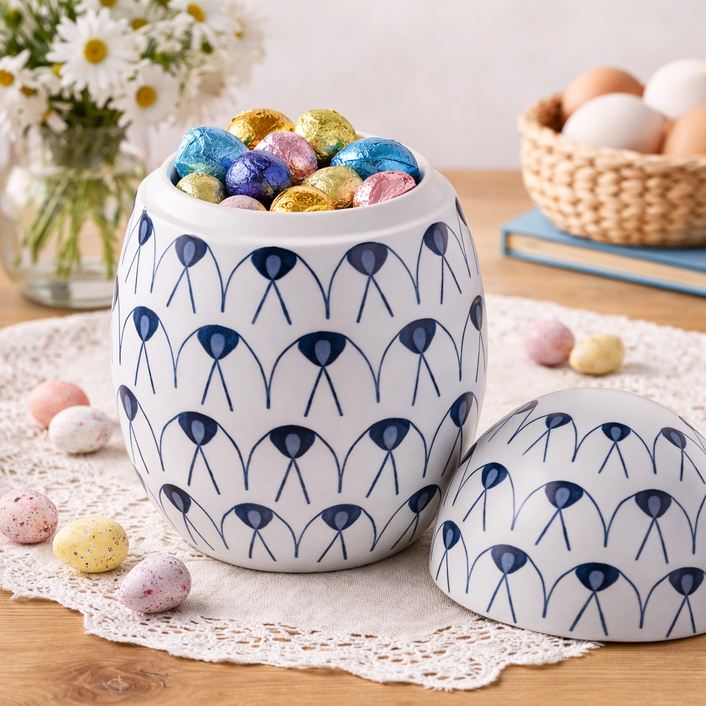 Contenitore Uovo Porta Oggetti in Ceramica Ø 14 cm - Villa D'Este: L'eleganza pasquale si esprime nella ceramica di pregio del contenitore uovo Easter firmato Villa D’Este. Parte della nuova collezione in ceramica bianca lucida che omaggia la tradizione, questo elegante portaoggetti a forma di uovo presenta un delicato motivo geometrico in sfumature di blu. Le sue dimensioni e la notevole capacità lo rendono ideale per custodire prelibatezze come caramelle e cioccolatini incartati, elevando l'estetica del tuo ambiente pasquale. Perfetto per essere esposto come elemento decorativo o per completare una mise en place durante le festività di Pasqua. Si raccomanda il lavaggio a mano per preservarne la bellezza nel tempo.