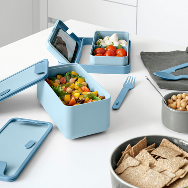 Il Portapranzo Set Lunchbox Ermetico Colore Blu con Posate - Bauletto Blim è perfetto per i pasti fuori casa. Lavabile in lavastoviglie, include un set di posate e un separatore interno per mantenere i cibi separati senza contaminazioni. Dotato di valvola di sfiato del vapore per l'uso in microonde, è stabile grazie alla base con piedini antiscivolo. Facile da chiudere e trasportare grazie al morbido manico, il coperchio si trasforma in un supporto per telefono. I coperchi sono completamente ermetici e garantiscono una tenuta stagna al 100%.