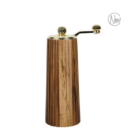 Questo macina sale e pepe manuale unisce estetica e funzionalità in un oggetto che sta benissimo sia in cucina sia a tavola. Il corpo è realizzato in legno di acacia, con una forma conica slanciata e una lavorazione a doghe verticali che mette in risalto le venature naturali del legno. La parte superiore e la manovella hanno una finitura dorata, dettaglio elegante che valorizza l’insieme senza risultare eccessivo.