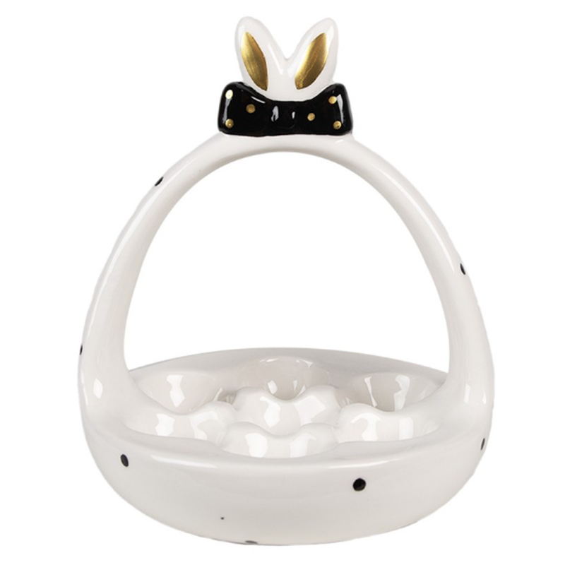 La forma a guscio d’uovo con manico ad arco è impreziosita da un dettaglio superiore con fiocco nero e orecchie, un richiamo discreto e raffinato all’atmosfera pasquale. Il contrasto cromatico bianco e nero, con piccoli accenti dorati, rende il portauova facile da abbinare a diverse mise en place, dal moderno al più decorativo.