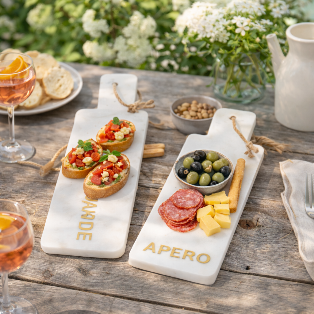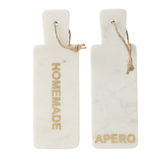 Ogni tagliere presenta un’incisione decorativa diversa, “APERO” e “HOMEMADE”, che aggiunge un tocco contemporaneo e rende il set versatile sia per l’uso quotidiano sia per momenti conviviali. La forma rettangolare li rende pratici e facili da posizionare su tavola o piani cucina.