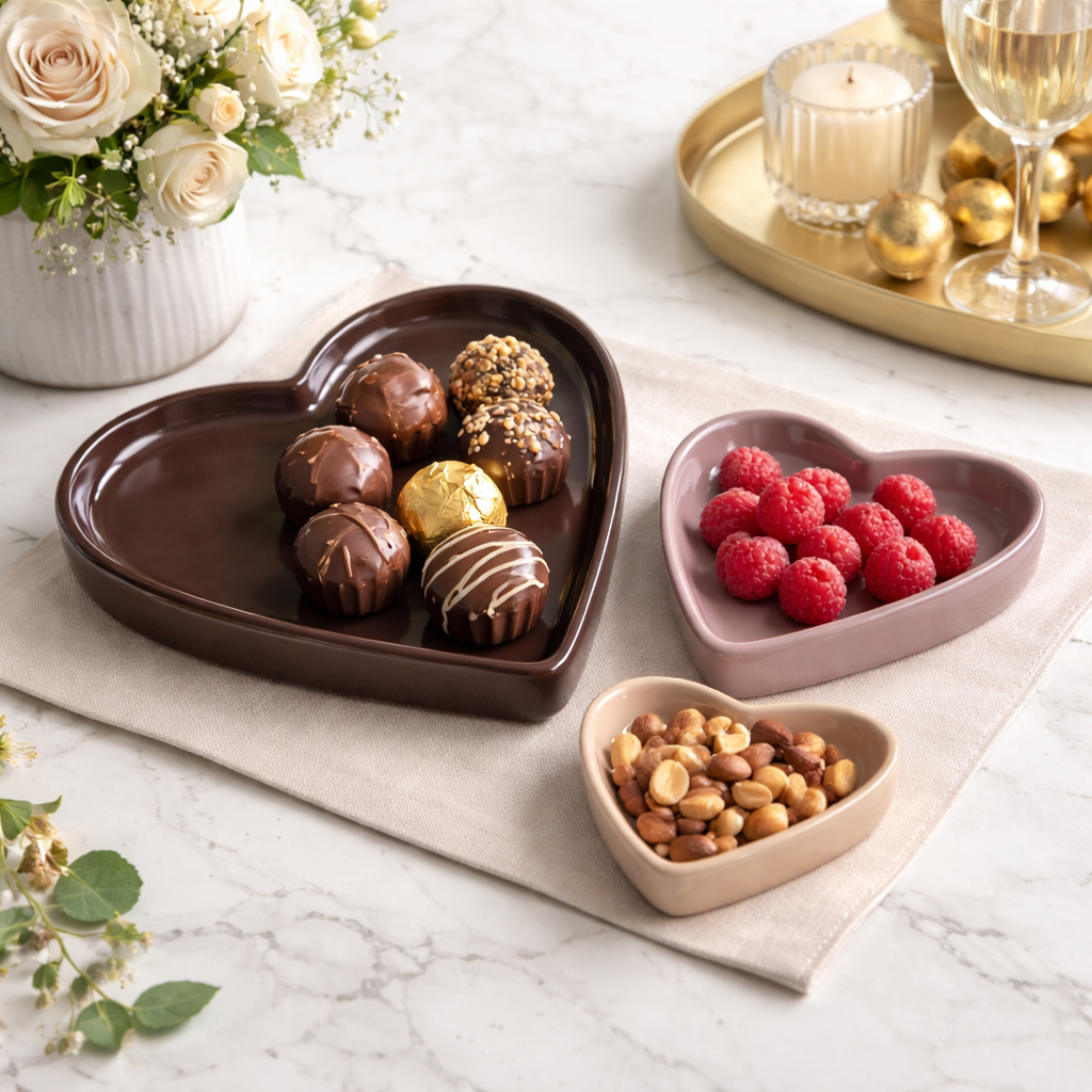 Le tre dimensioni — Ø 23 × 11 cm, Ø 18 × 10 cm e Ø 13 × 10 cm — permettono di utilizzarle insieme come composizione decorativa oppure singolarmente, in base allo spazio e alla funzione. Possono essere impiegate come centrotavola, svuotatasche o portaoggetti, ma anche per decorare la tavola, ad esempio come portacioccolatini, porta caramelle, frutta secca o piccoli dolci, durante pranzi, cene o momenti conviviali.