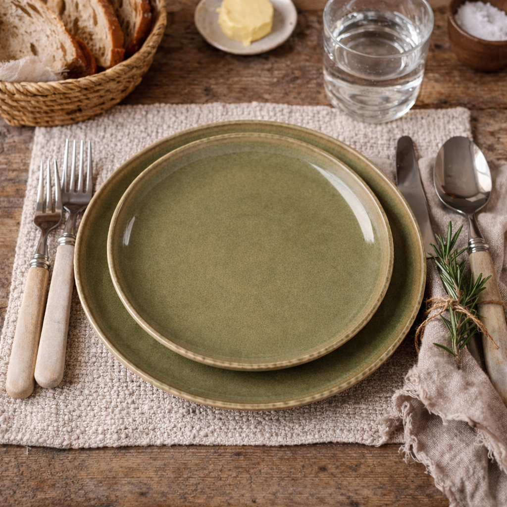 La superficie centrale liscia valorizza la presentazione degli alimenti, mentre la finitura materica con righe verticali concentrata sul bordo riprende il segno distintivo della collezione, aggiungendo profondità visiva senza appesantire il design. La tonalità verde salvia contribuisce a creare una mise en place armoniosa e rilassante, facilmente abbinabile agli altri elementi della linea.