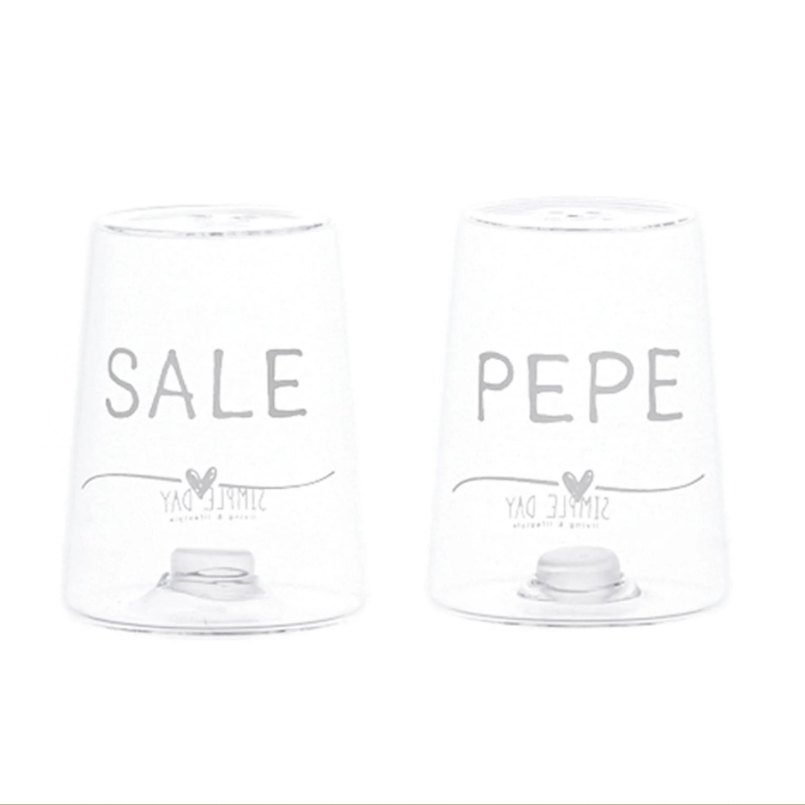 Realizzati in vetro borosilicato, i contenitori risultano leggeri ma resistenti, particolarmente adatti all’uso quotidiano. Il materiale garantisce elevata trasparenza e una buona durabilità nel tempo. Le scritte “Sale” e “Pepe”, serigrafate in bianco, sono accompagnate da un piccolo cuore discreto, che aggiunge un dettaglio decorativo senza risultare invasivo.