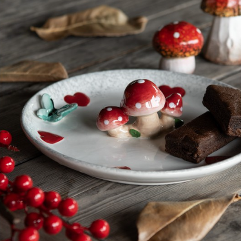 Vassoio Decorativo in Ceramica con Funghi e Cuori Ø 21 cm per la Tavola